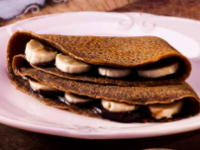 Distribua metade do recheio entre os crepes reservados, colocando bem no centro de cada um deles. Espalhe as bananas e dobre-os ao meio e depois ao meio novamente, formando um triângulo.